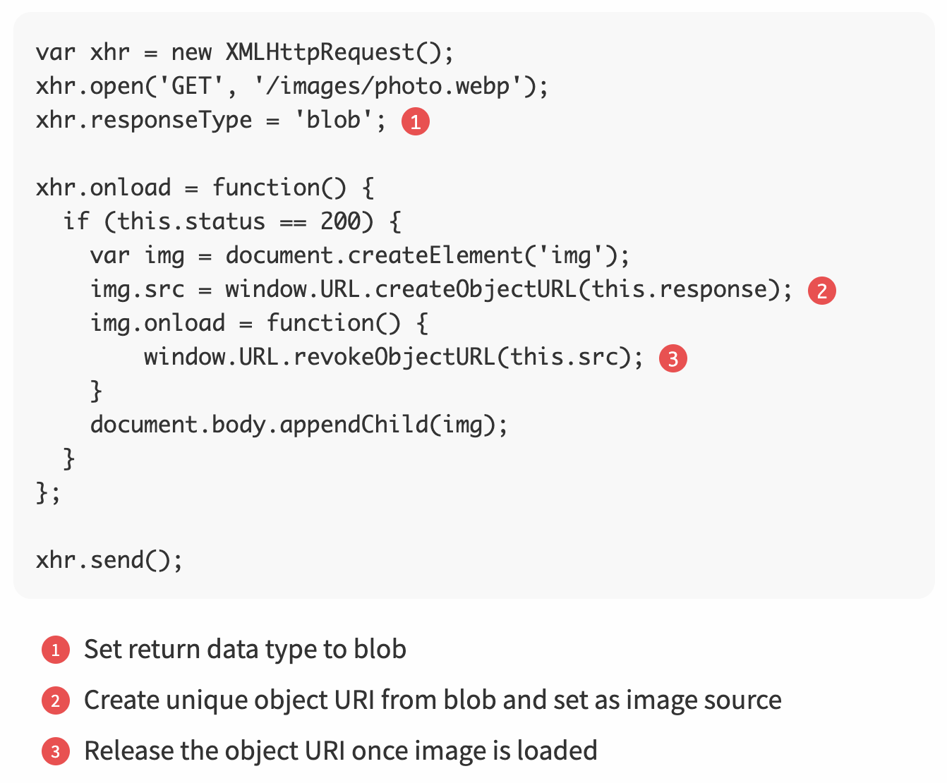- note that we are transferring an image asset in its native format, without relying on base64 encoding, and adding an image element to the page without relying on data URIs.